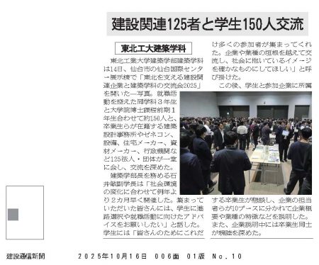建築学科が毎年企画している「東北を支える建設関連企業と建築学科の交流会」が、10月14日(火)に仙台国際センターで開催されました。