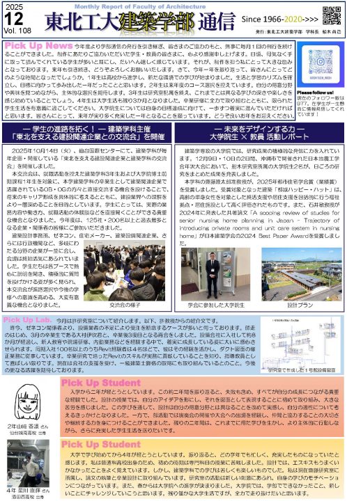 今年度より学部通信の発行を引き継ぎ、皆さまのご協力のもと、無事に毎月1回の刊行を続けることができました。制作にあたりご協力いただいた学生・教員の皆さまに、心より感謝申し上げます。日頃、何気なく手に取って読んでくれている学生が多いと耳にし、たいへん嬉しく感じています。それが、制作を担う私にとって大きな励みとなっております。来年も引き続き、どうぞよろしくお願いいたします。さて、今年一年を振り返って、皆さんにとってどのような時間となったでしょうか。1年生は高校から進学し、新たな環境での学びが始まりました。生活と学習のリズムを確立し、目標に向かって歩み出した一年だったことと思います。2年生は来年度のコース選択を控えています。自分の得意分野や興味を見つめながら、主体的な選択を期待します。3年生は研究室配属を終え、これまでとは異なる学びの深さや楽しさを感じ始めていることでしょう。4年生は大学生活も残り3か月となりました。卒業研修に全力で取り組むとともに、限られた学生生活を有意義に過ごしてください。大学院生については自身の目標達成に向けて、一歩ずつ着実に進んでいただければと思います。皆さんにとって、来年が実り多く充実した一年となることを願っています。どうぞ良いお年をお迎えください。