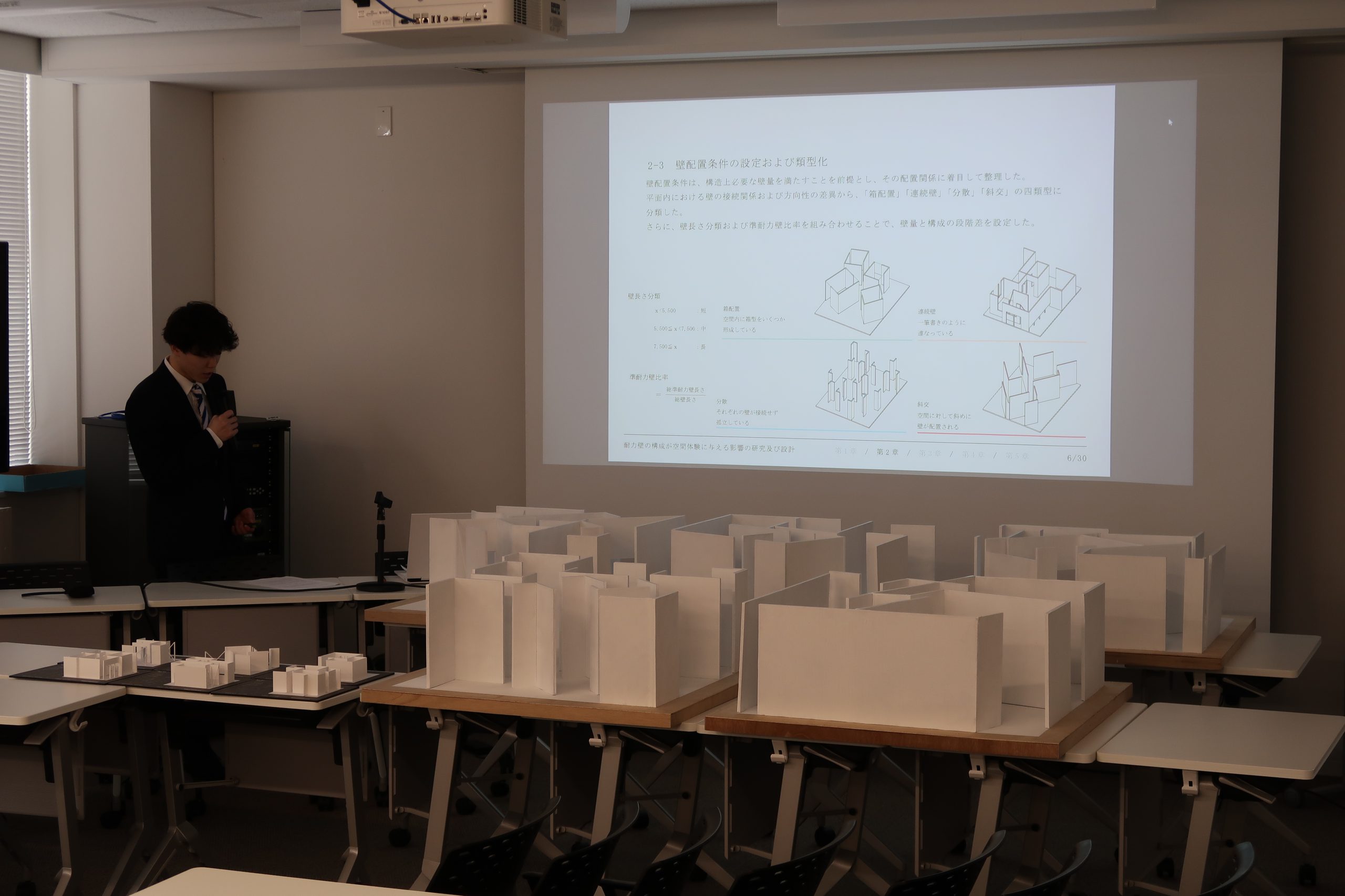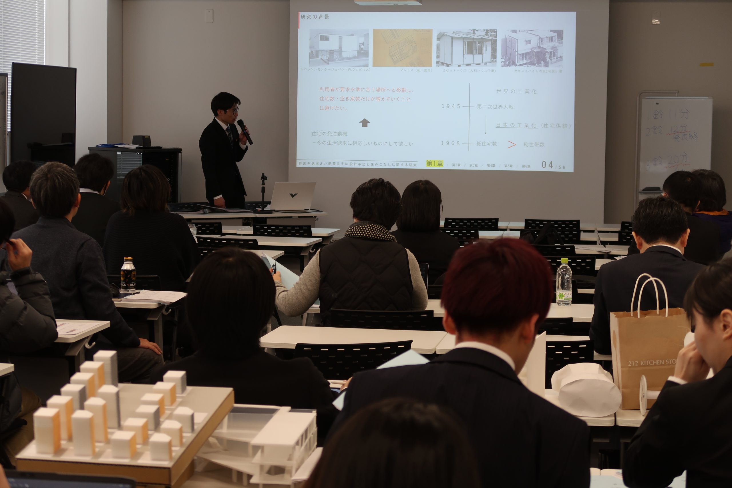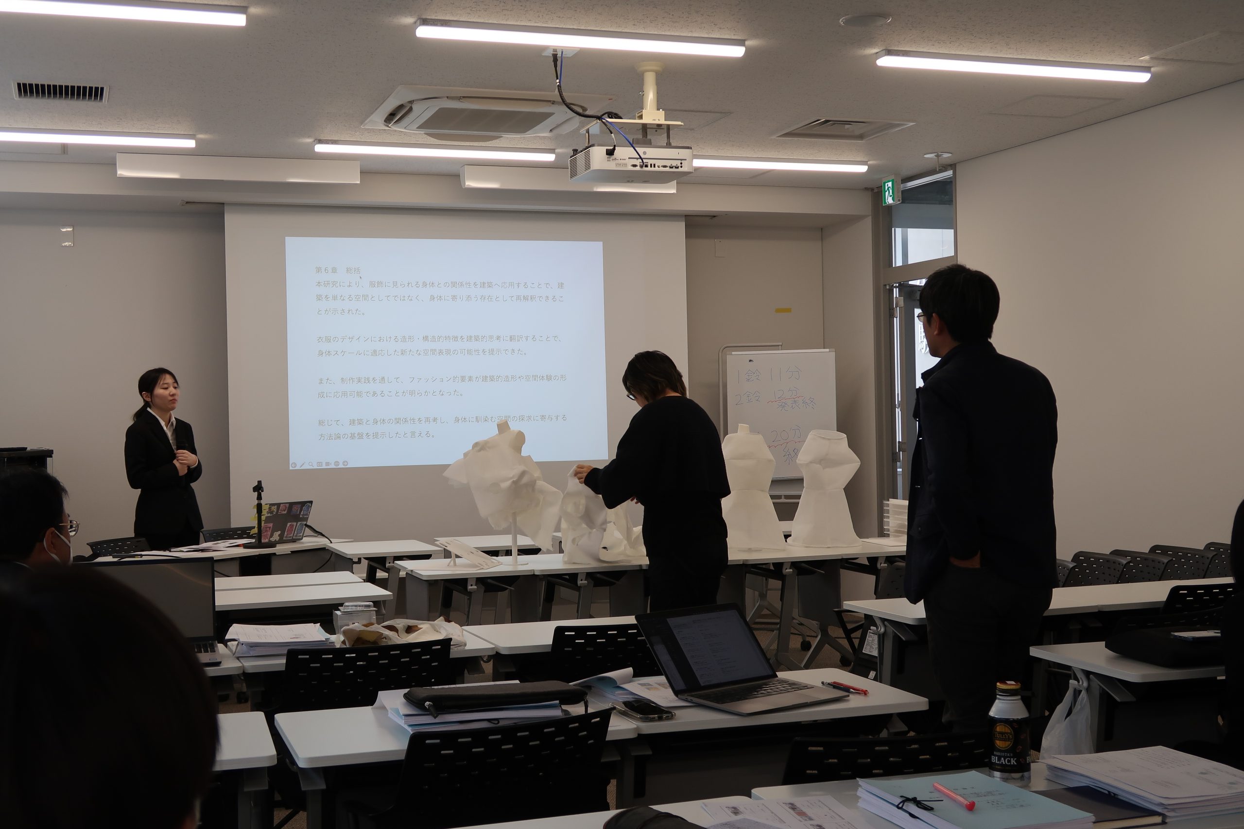 これまでの2年間の集大成となる発表に、会場にはほどよい緊張感と温かい空気が広がりました。発表者は、自身の研究や設計に込めた思いや工夫、そして社会への提案を丁寧に伝え、教員からは分野を越えたさまざまな視点からの質問やコメントが寄せられました。活発なやり取りを通して、議論はさらに深まり、充実した時間となりました。