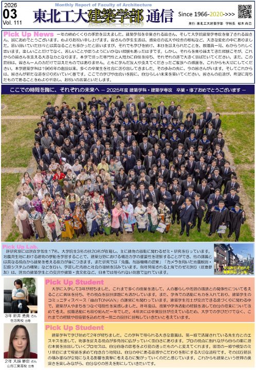一年の締めくくりの季節を迎えました。建築学部を卒業される皆さん、そして大学院建築学専攻を修了される皆さん、誠におめでとうございます。心よりお祝い申し上げます。皆さんの学生生活は、感染症の拡大や校舎の移転など、大きな変化の中にありました。思い描いていた日々とは異なることも多かったと思いますが、それでも学びを続け、本日を迎えられたことを、教職員一同、心からうれしく思います。楽しいことだけでなく、苦しいことや思うようにいかない経験もあったはずです。しかし、それらを乗り越えてきた経験こそが、これからの皆さんを支える大きな力となります。本学で培った専門性と人間力に自信を持ち、それぞれの道で大きく羽ばたいてください。また、この節目は、皆さん一人の力だけで迎えたものではありません。ともに学んだ友人や支えてくださったご家族への感謝を、これからも大切にしてください。本学建築学科は1966年の創設以来、多くの卒業生を社会に送り出してきました。その歩みの先に、今の皆さんがいます。そしてこれからは、皆さんが新たな道を切り拓いていく番です。ここでの学びや出会いを胸に、自分らしい未来を築いてください。皆さんの前途が、希望に満ちたものであることを心より祈念し、お祝いの言葉といたします。