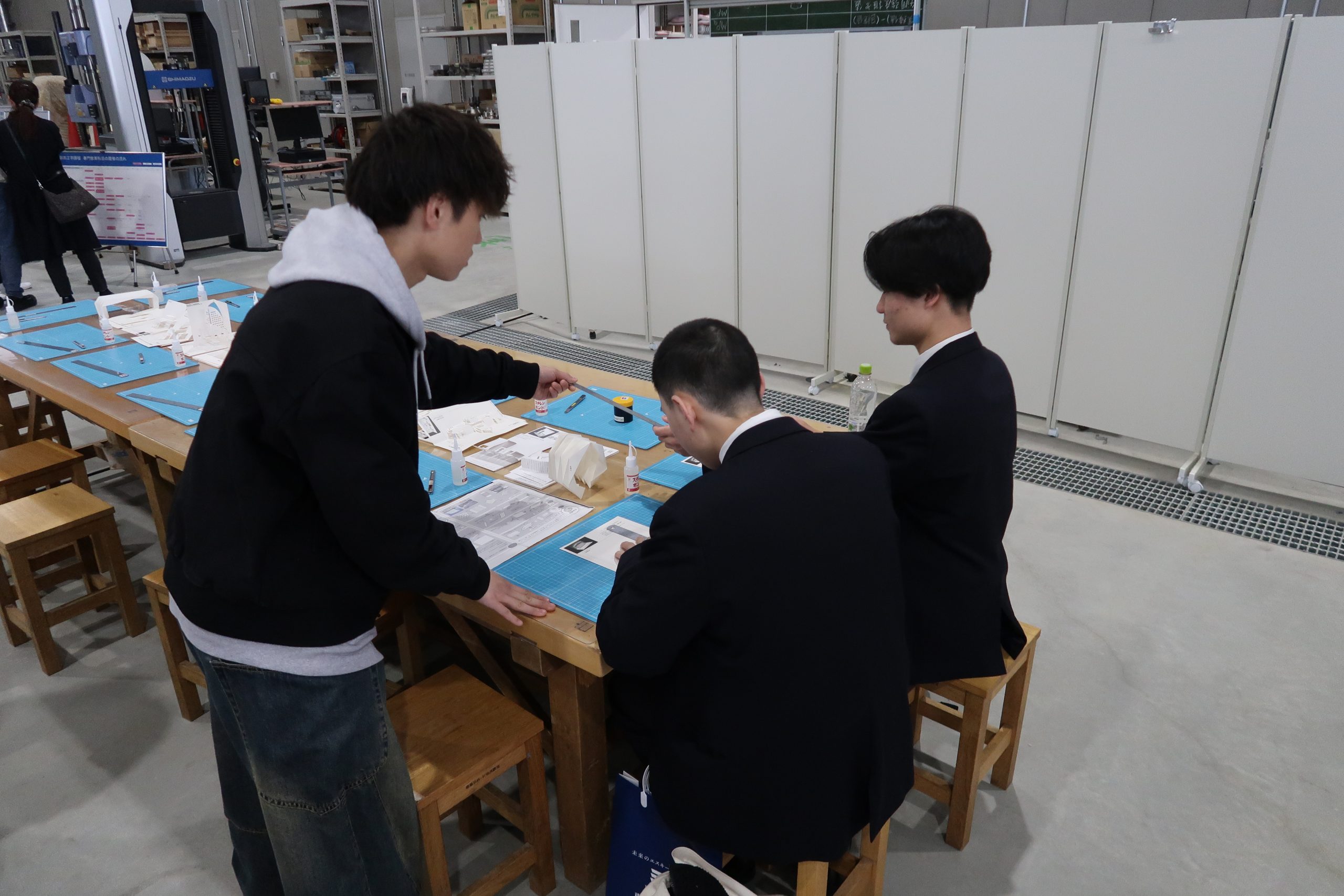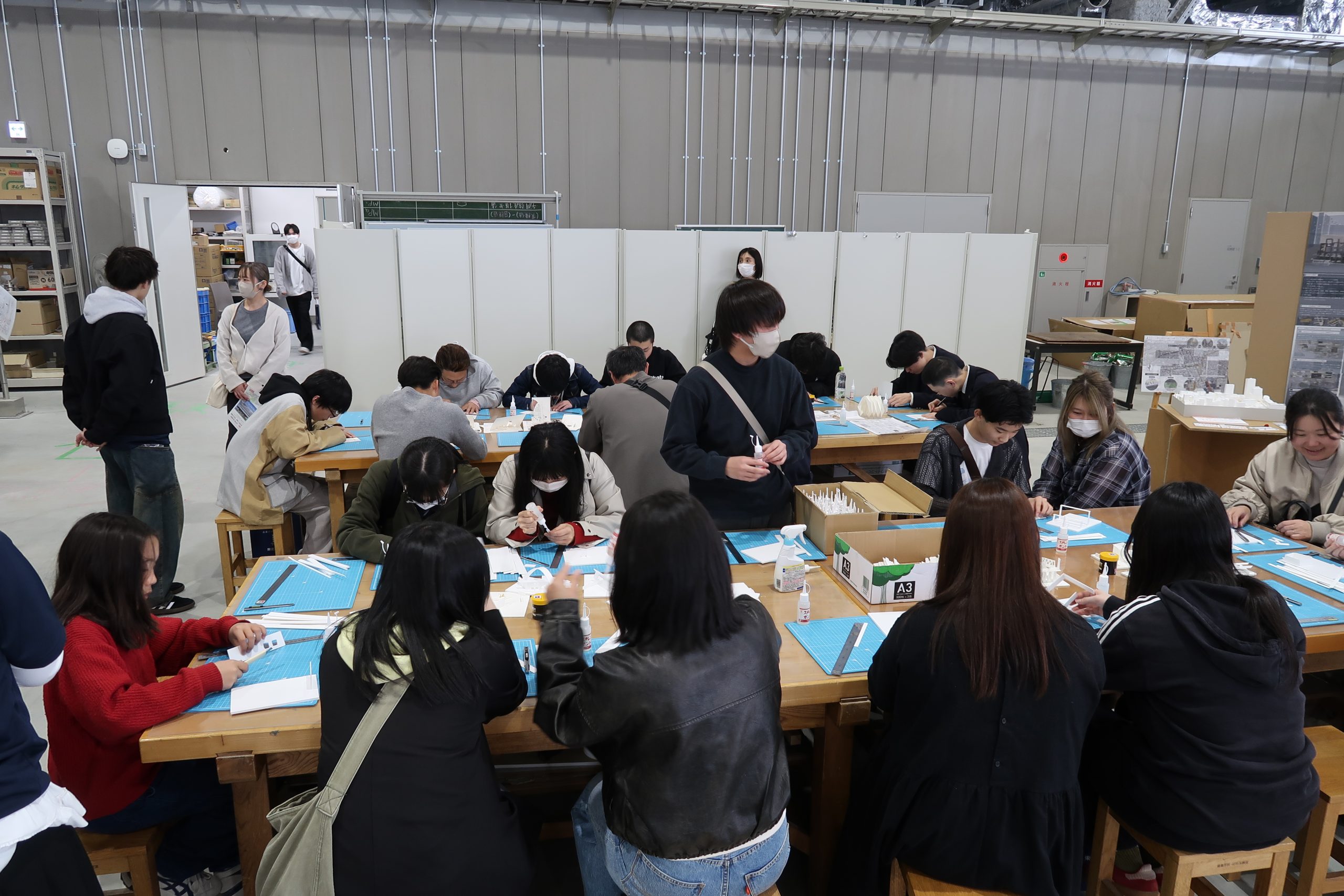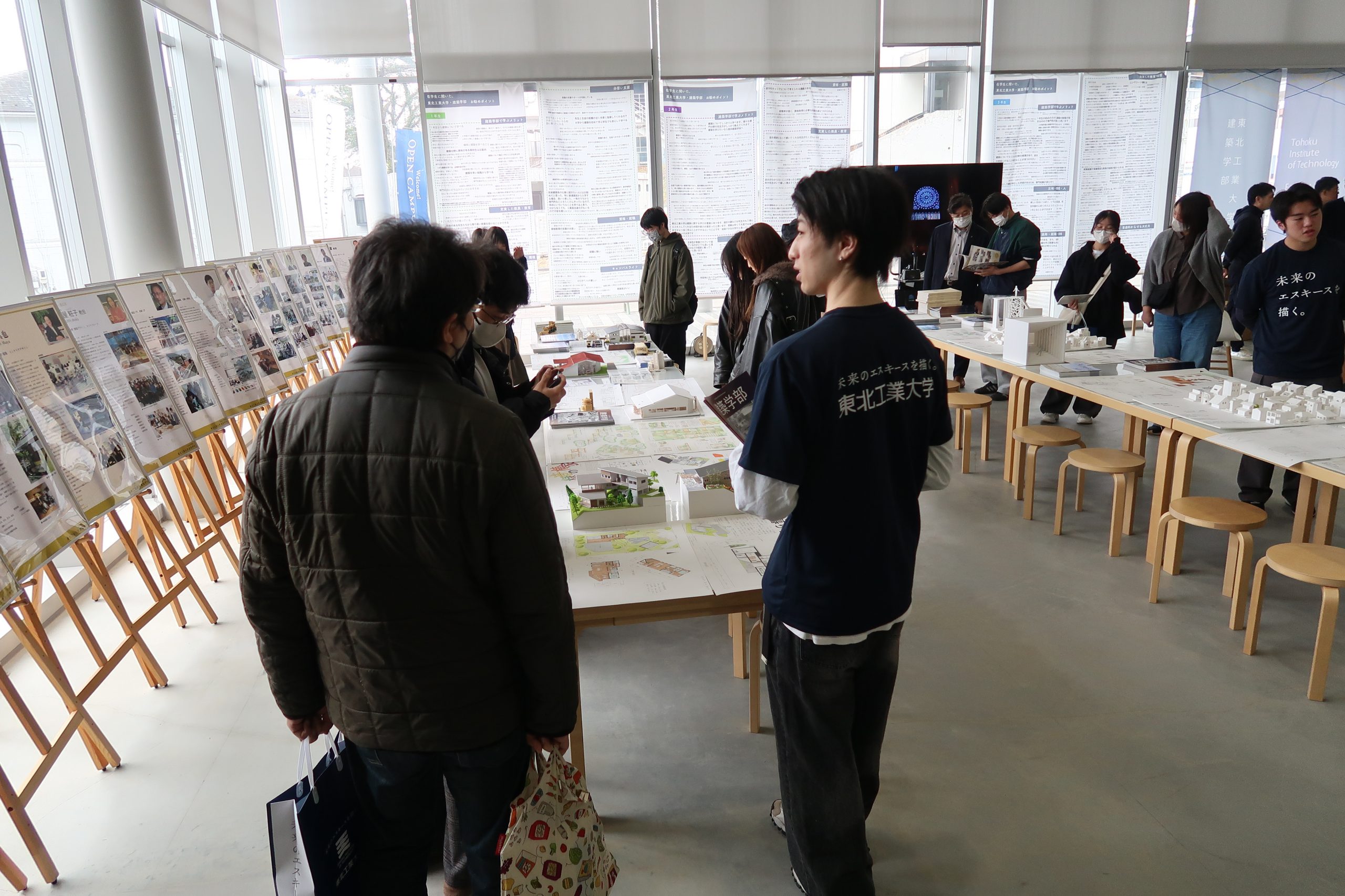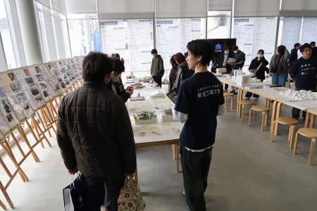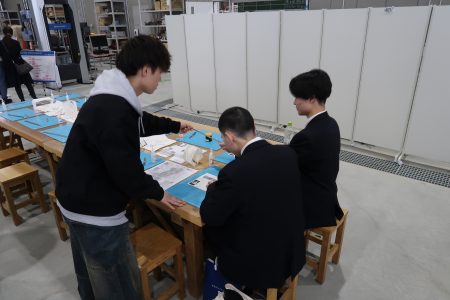 模型づくり体験では、手を動かしながら空間づくりの面白さを体感していただき、会場では学生作品の展示も行われるなど、参加者は建築の多様な学びに触れていました。また、教員や在学生との交流を通して、キャンパスの雰囲気や学生生活を身近に感じていただける機会となりました。
