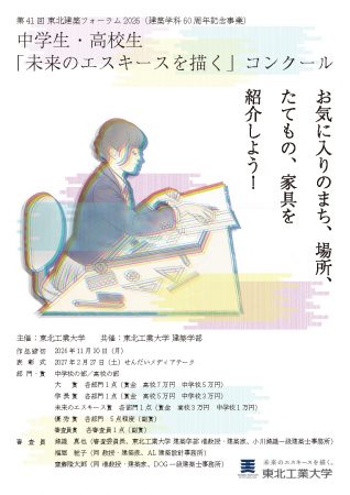 中学生・高校生の皆様に、町や建築、インテリア、家具などに興味関心をもって頂こうと、中学生・高校生「未来のエスキースを描く」コンクールを昨年度に引き続き開催します。テーマは、お気に入りのまち、場所、たてもの、家具を紹介しよう!。自らのスケッチや写真、文章や図表などを組み合わせて、A3サイズ1枚のポスター(プレゼン・ボード)で町や建築の魅力を表現してください。申し込みや作品制作の詳細は、下記の東北建築フォーラムサイトをご確認ください。