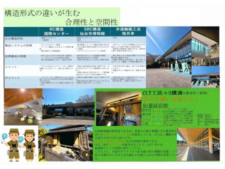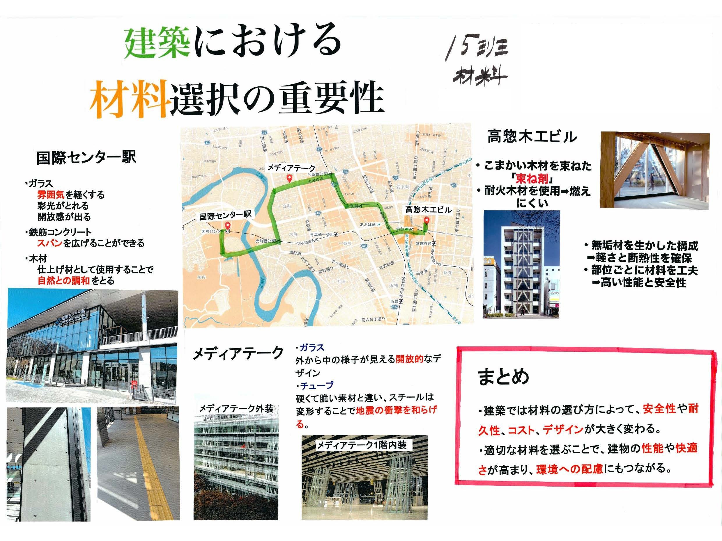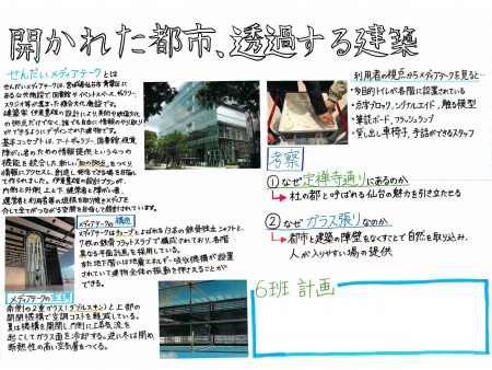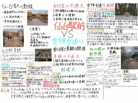 前期オリエンテーション期間中、「計画・歴史・環境・構造・材料」の5つのテーマに分かれ、約20チームによる仙台のまち歩きワークショップを実施しました。学生たちはグループごとに街へ繰り出し、建築的な視点から仙台の街並みを観察・探索。1年生にとっては、普段何気なく見ている風景の中に新たな気づきや発見が生まれる、刺激的な学びの機会となりました。