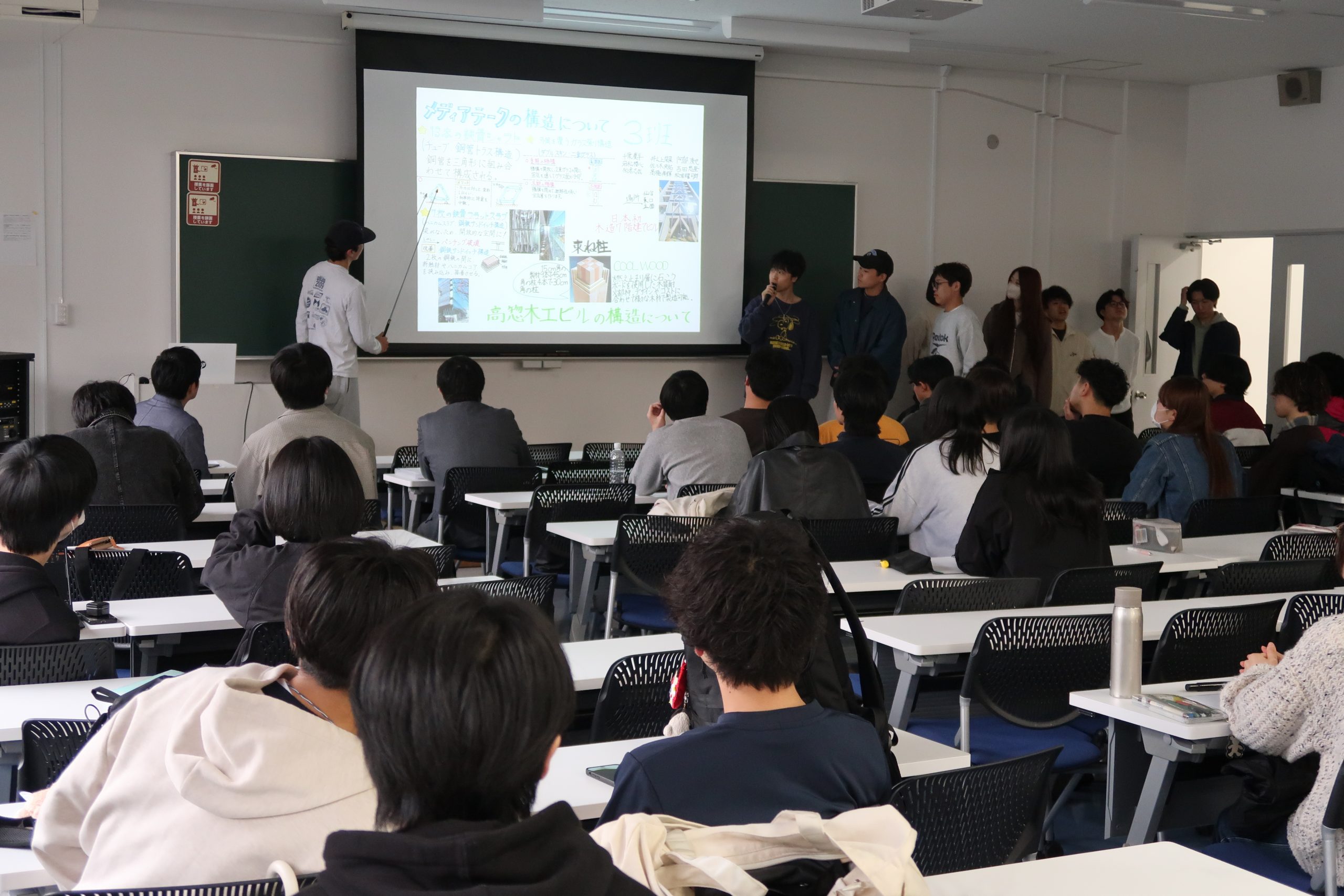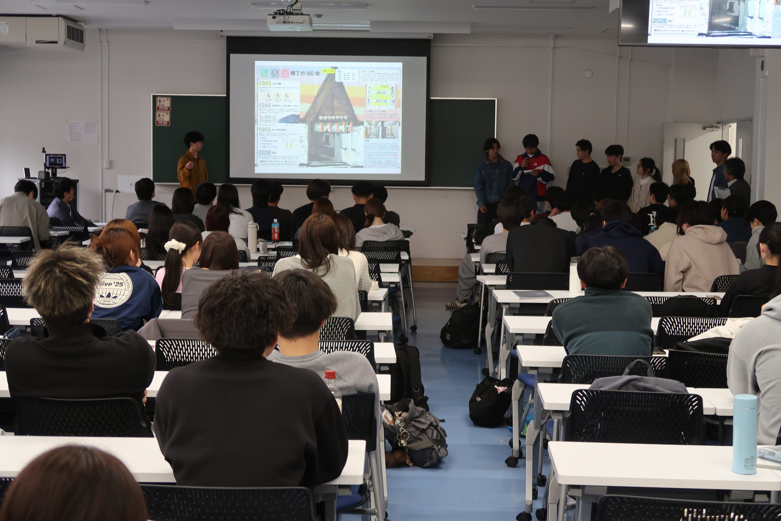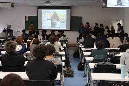 4月27日には、各班によるプレゼンテーションを開催。調査で得た成果をスライドにまとめ、1年生や学科教員の前で発表しました。発表会場では、チームごとの個性あふれる視点や工夫が共有され、時に笑いや驚きも生まれるなど、終始活気に満ちた時間となりました。